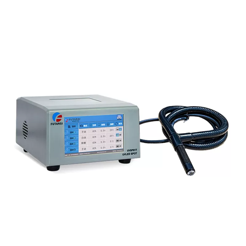 复坦希电子科技生产研发的UVLED点光源固化机,采用进口LED灯珠,具有能量高、光源稳定等优点,可根据使用需求选择一拖四、一拖八UVLED点光源照射头。UVLED点光源采用触摸屏控制方式,功率可调(0%-100%),可自由设定照射时间。设备体积小,安装方便,可配合流水线车间使用。