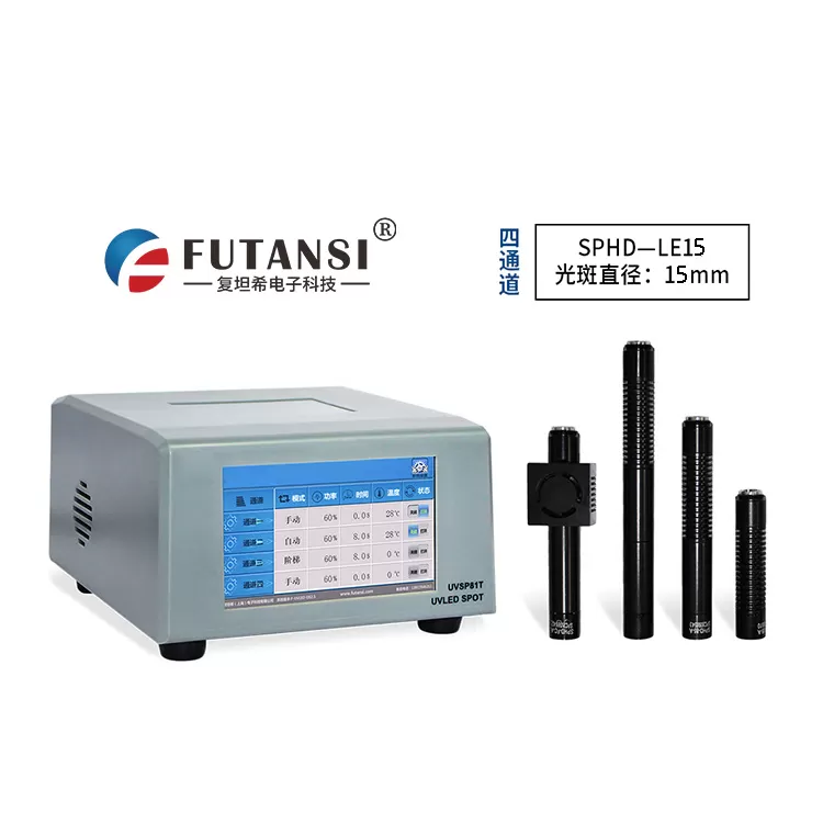 复坦希电子科技生产研发的UVLED点光源固化机,采用进口LED灯珠,具有能量高、光源稳定等优点,可根据使用需求选择一拖四、一拖八UVLED点光源照射头。UVLED点光源采用触摸屏控制方式,功率可调(0%-100%),可自由设定照射时间。设备体积小,安装方便,可配合流水线车间使用。